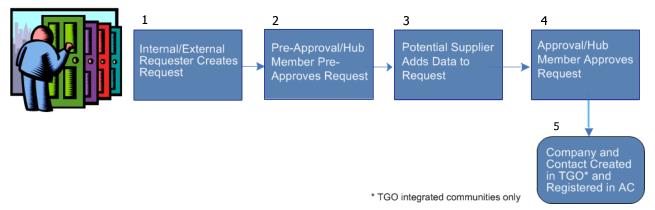 A registration workflow drives the online request and approval (commonly referred to as “onboarding”) process. For example, a registration request might follow the approval process outlined in the graphic.